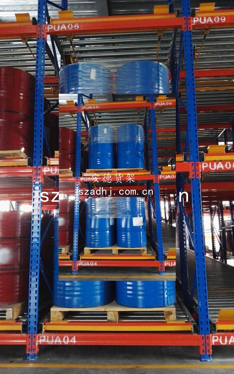 產(chǎn)品介紹:由常規(guī)貨架立柱、橫梁、輥道相結(jié)合組裝,變成一種新型產(chǎn)品貨架。安裝面形成一定的傾斜角度,約為5°,進(jìn)口處有導(dǎo)向口,防止偏移軌道;托盤(pán)在輥筒上緩慢向前移動(dòng),配合阻尼器使用,以防速度過(guò)快,發(fā)生掉落;到達(dá)出貨口,貨物托盤(pán)壓在停止器上,該貨物已做好出貨準(zhǔn)備;托盤(pán)貨物依次出貨。從而達(dá)到先進(jìn)先出的效果,有效清空了庫(kù)存。