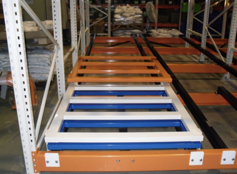 所以如何解決上述問題呢?我們通道在重型貨架基礎上改裝成后推式貨架。怎么操作呢?就是一個通道內,叉車將貨物托盤朝深度方面,一個接一個的放置在限位托盤上,貨架上的托盤呈現一定的角度,以便可以限位卡住,以至于不向下傾滑。但是最多只能放置四托貨物。畢竟重量大,傾斜角度不宜多大,載重量也不宜過載。造成不必要的損失。如需更大的放貨量,就建議做重力式貨架了。