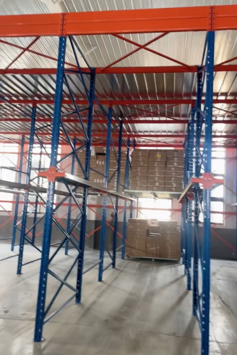 2、有了貫通貨架立柱片,安裝貨架平臺,省立柱材料,結構穩固