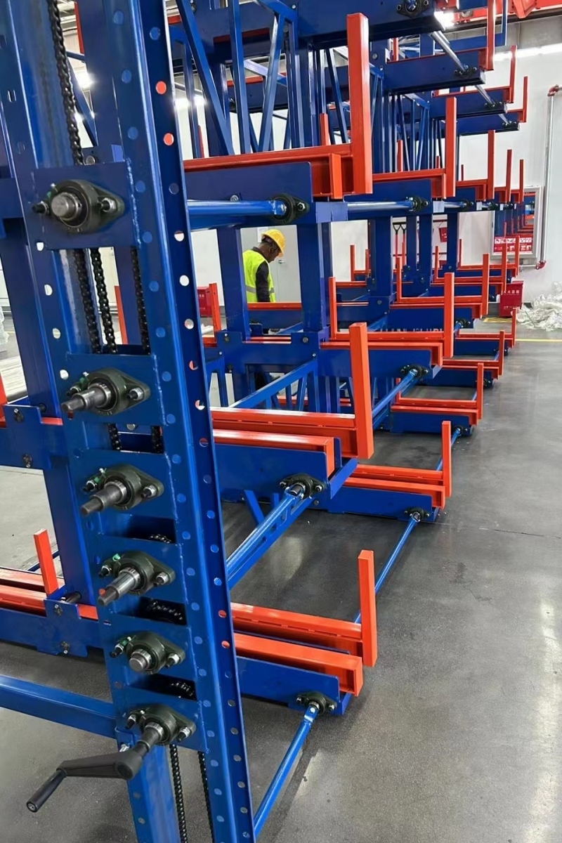 它的優勢就在于可以長條形無限延長安裝,根據需求斷開或者連接。它的缺點就是需要相對較大的場地使用,那么場地不夠,又想使用該款產品應該如何解決呢?我們研發一款新型的伸縮懸臂貨架,供客戶使用。這時候伸縮懸臂的優勢就體現出來了,由于場地的限制,使用遙桿,搖出懸臂向外伸出,然后行車取出貨物,再搖進原來位置,一套使用流程結束。還可以加裝電動裝置,電動遙控伸縮懸臂,非常便利。