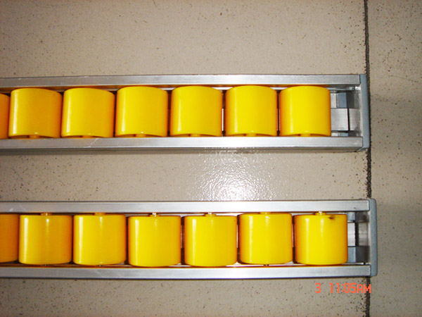 流利式貨架結構特點:流利式貨架的流利條直接連接到前后橫梁及中間支撐梁上,橫梁直接掛在支柱上,流利條安裝傾斜度取決于貨箱的尺寸、重量以及流利架的深度,通常取5%~9%。流利條滾輪的承載力為6kg/只,當貨物較重時,可以在一個滾道安裝3-4根流利條。通常在深度方向上每隔0.6m安裝一根支撐梁以增加流利條的剛度。當滾道較長時,可用分隔板將滾道隔開。取貨端需安裝制動片使貨物減速,降低沖擊。