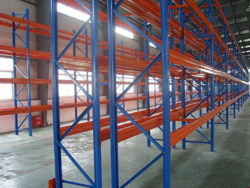貫通式貨架又稱通廊式貨架或駛?cè)胧截浖堋X炌ㄊ截浖芸晒┎孳嚕ɑ驇ж洸娴臒o人搬運車)駛?cè)胪ǖ来嫒∝浳铮m用于品種少,批量大類型的貨物儲存。貫通式貨架除了靠近通道的貨位,由于叉車需要進入貨架內(nèi)部存取貨物,通常單面取貨建議不超過7個貨位深度。為提高叉車運行速度,可根據(jù)實際需要選擇配置導(dǎo)向軌道,與貨位式貨架相比,貫通式貨架(駛?cè)胧截浖埽┑膸炜臻g利用率可提高30%以上,貫通式貨架(駛?cè)胧截浖埽⿵V泛應(yīng)用于批發(fā)、冷庫及食品、煙草行業(yè)。