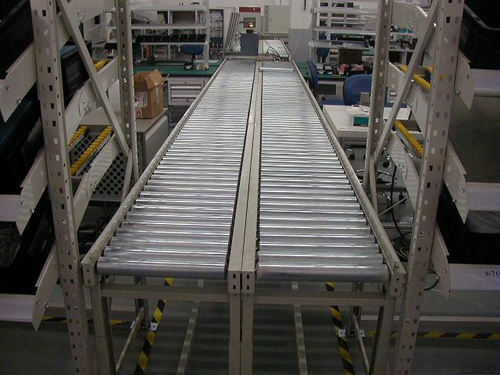 在貨架的組與組之間沒有作業(yè)通道,從而增加了60%的空間利用率,提高了倉儲的容積率;托盤操作遵循先進先出的原則;自動儲存回轉(zhuǎn);儲存和揀選兩個動作的分開大大提高輸出量,由于是自重力使貨物滑動,而且沒有操作通道,所以減少了運輸路線和叉車的數(shù)量.